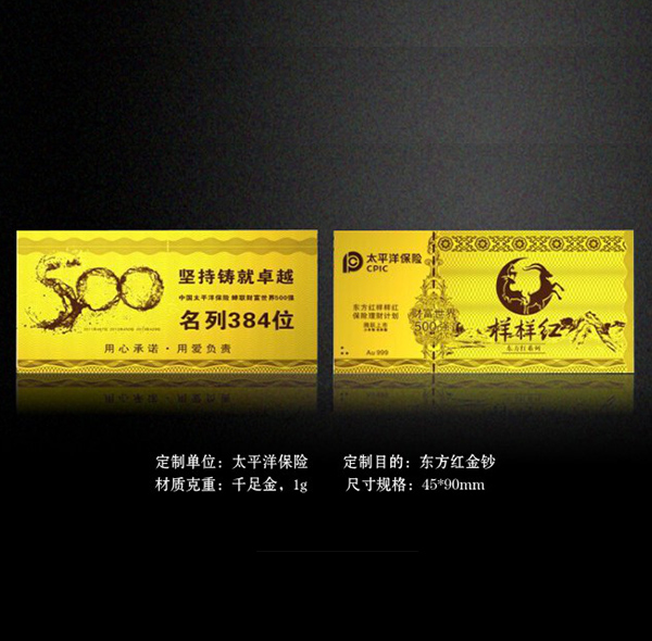 相關(guān)背景:太平洋保險定制了東方紅金鈔作為表彰福利,產(chǎn)品設(shè)計大氣,包裝精美